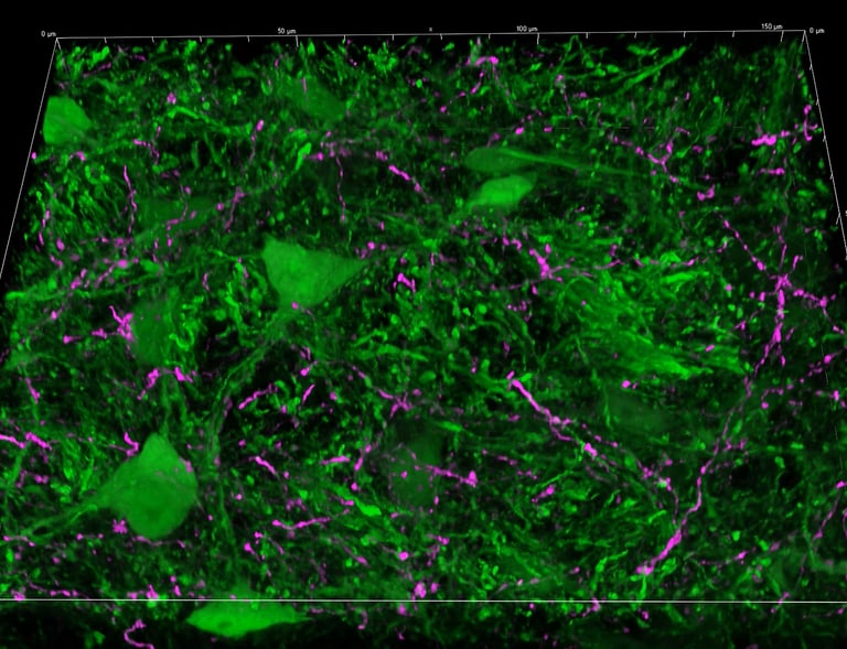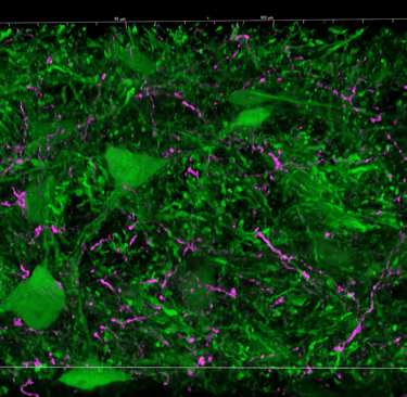 Amygdala fibers (magenta) closely apposed to brainstem glycinergic neurons (green)